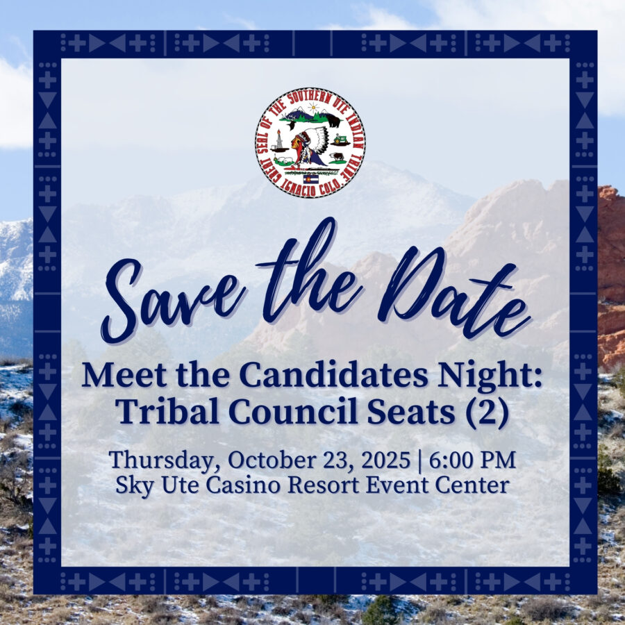 Please save the date for an upcoming event, Meet the Candidates Night: Tribal Council Seats (2) on Thursday, October 23, 2025, at 6:00 PM in the Event Center at Sky Ute Casino Resort.