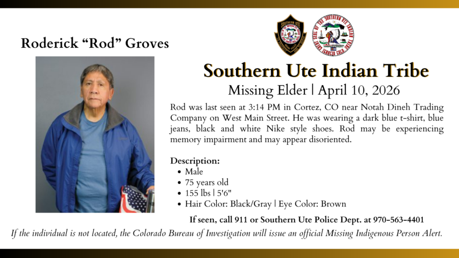 If seen, call 911 or Southern Ute Police Dept. at 970-563-4401. If the individual is not located, the Colorado Bureau of Investigation will issue an official Missing Indigenous Person Alert.