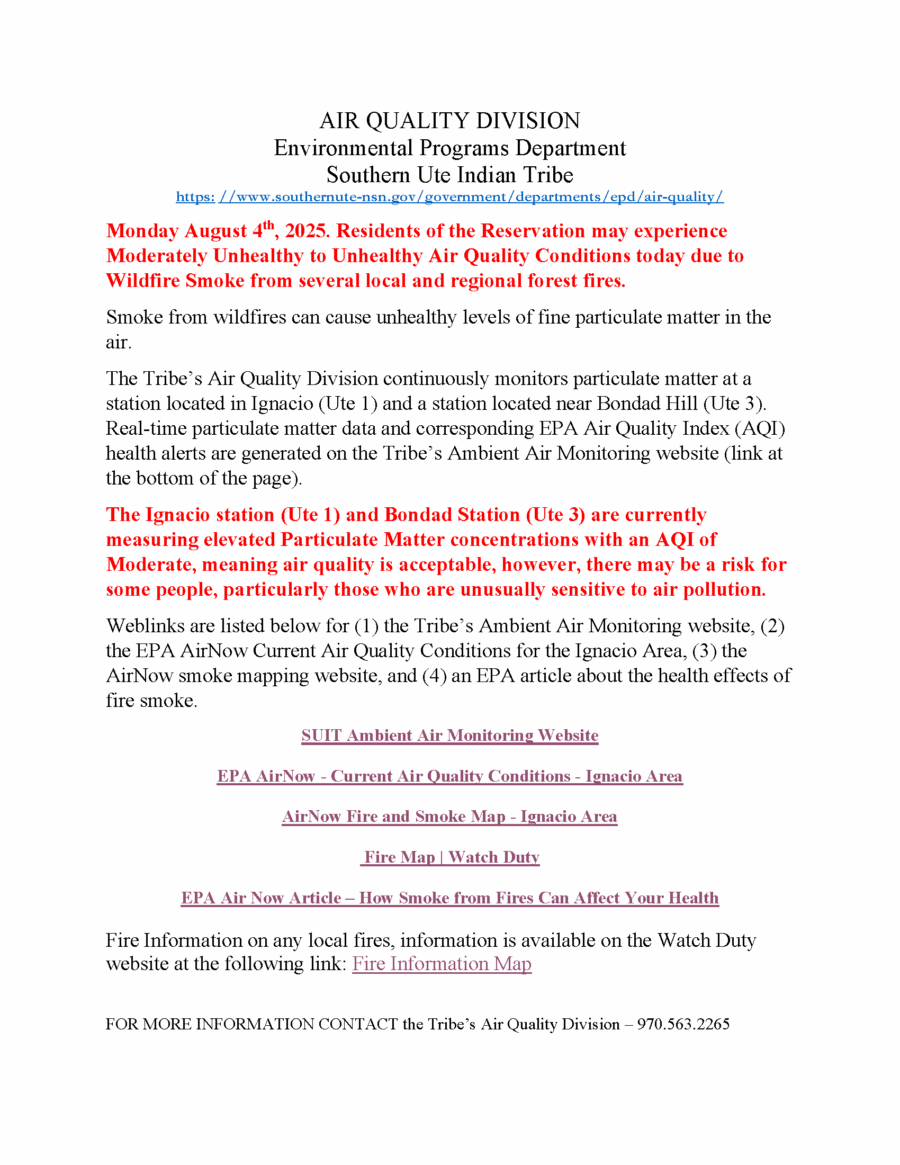 Weblinks are listed below for (1) the Tribe’s Ambient Air Monitoring website, (2) the EPA AirNow Current Air Quality Conditions for the Ignacio Area, (3) the AirNow smoke mapping website, and (4) an EPA article about the health effects of fire smoke.
