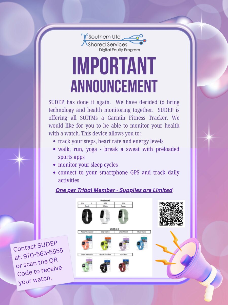 SUDEP is excited to offer Garmin Fitness Trackers to all Southern Ute Tribal Members—bringing together technology and wellness! 🏃♀️💓 Track your steps, heart rate, and energy levels to stay on top of your health goals.
