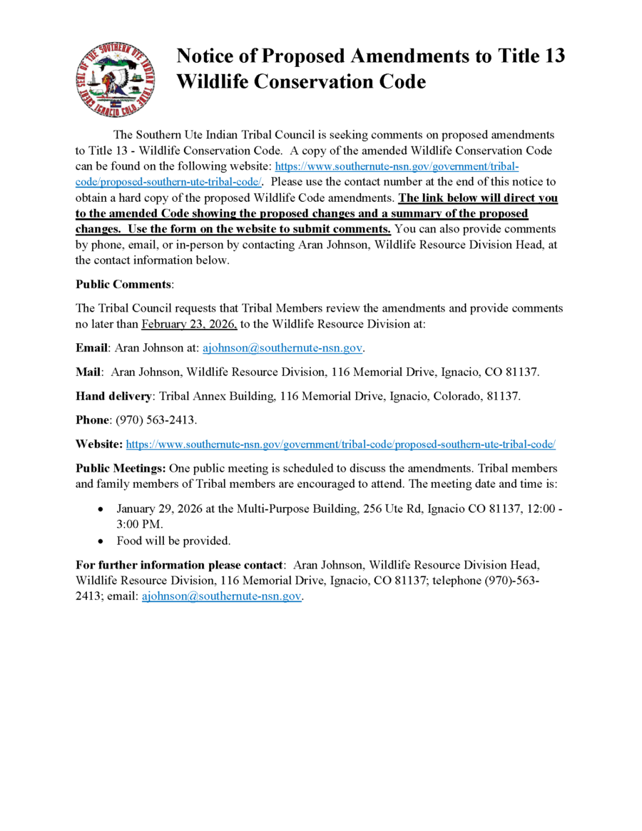 There is a public/informational meeting on the proposed Southern Ute Wildlife Code amendments tomorrow from 12:00-3:00 pm at the Southern Ute Multi-Purpose Facility. The information is in the attached notice. The QR codes take you to the webpage showing the notice and the second QR Code takes you to the comment form. Food will be provided. Please contact the Southern Ute Wildlife Division if you have any questions at (970 563-2417.