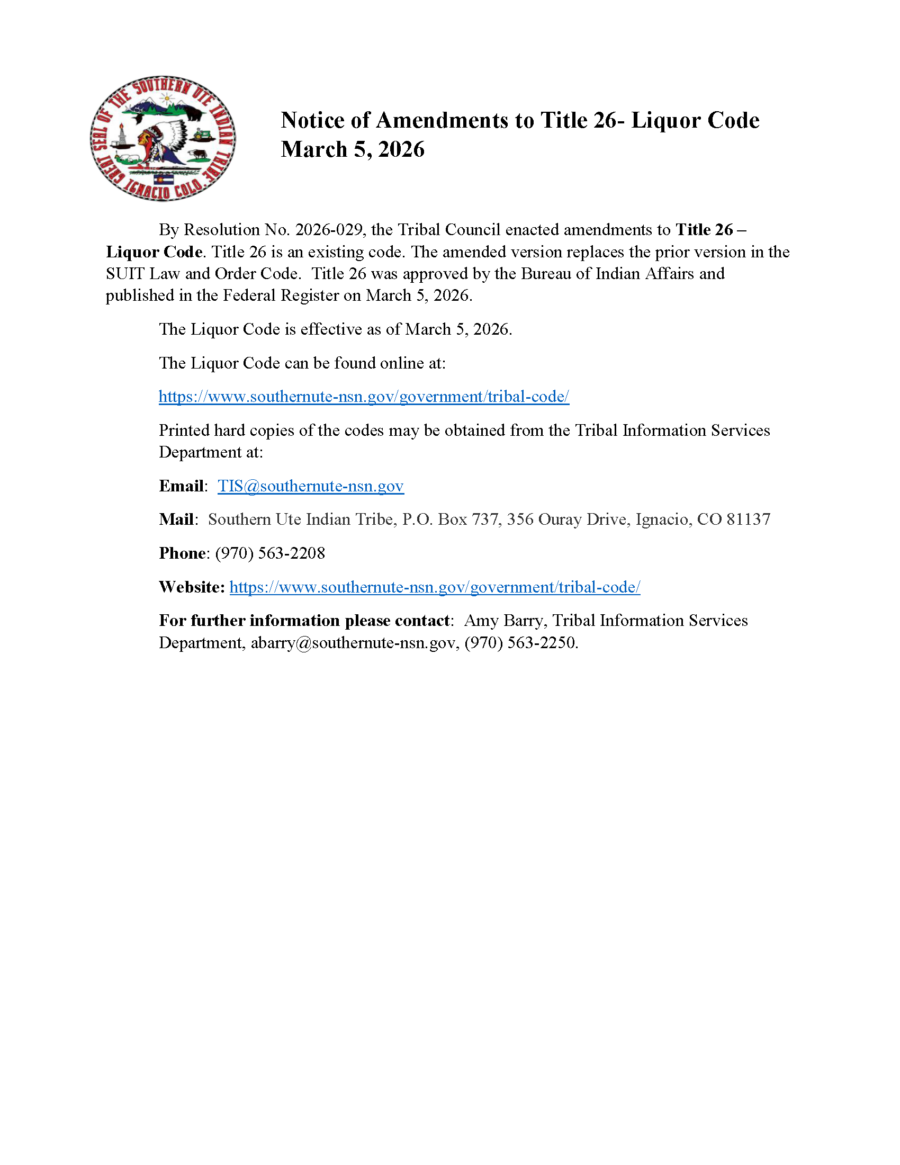By Resolution No. 2026-029, the Southern Ute Tribal Council enacted amendments to Title 26 – Liquor Code. Title 26 is an existing code. The amended version replaces the prior version in the SUIT Law and Order Code.