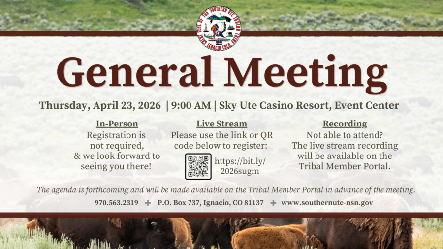 The agenda is forthcoming and will be made available on the Tribal Member Portal in advance of the General Meeting. For technical assistance with your “so-ute” account, please contact SUDEP at 970-563-5555. To create an account for TMX, please visit, https://www.southernute-nsn.gov/tmx/. For more information, please contact Tribal Council Affairs at 970-563-2313.