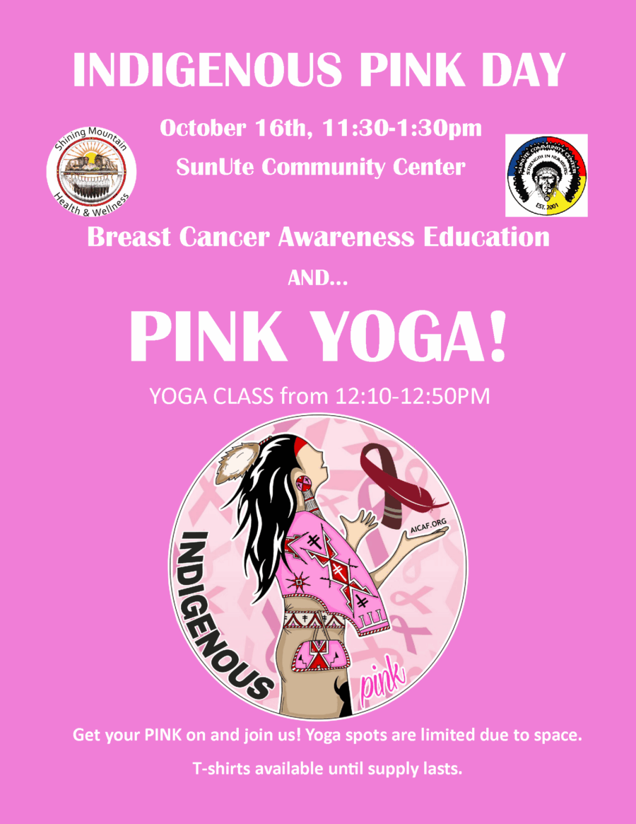 Come out and join Shining Mountain Health and Wellness on October 16th for Indigenous PINK Day to raise awareness of breast cancer across Indian Country. We will have information about the breast cancer, the importance of early detection and can assist you in completing your mammogram.