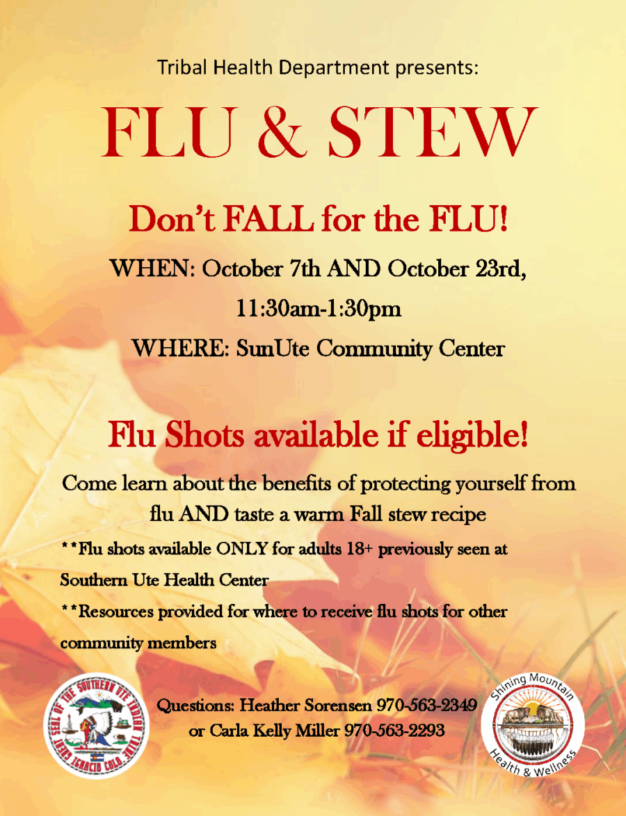 The Southern Ute Tribal Health Department will provide flu shots for adults 18+ who have been previously seen at Southern Ute Health Center. Other resources will be provided for other community members.
