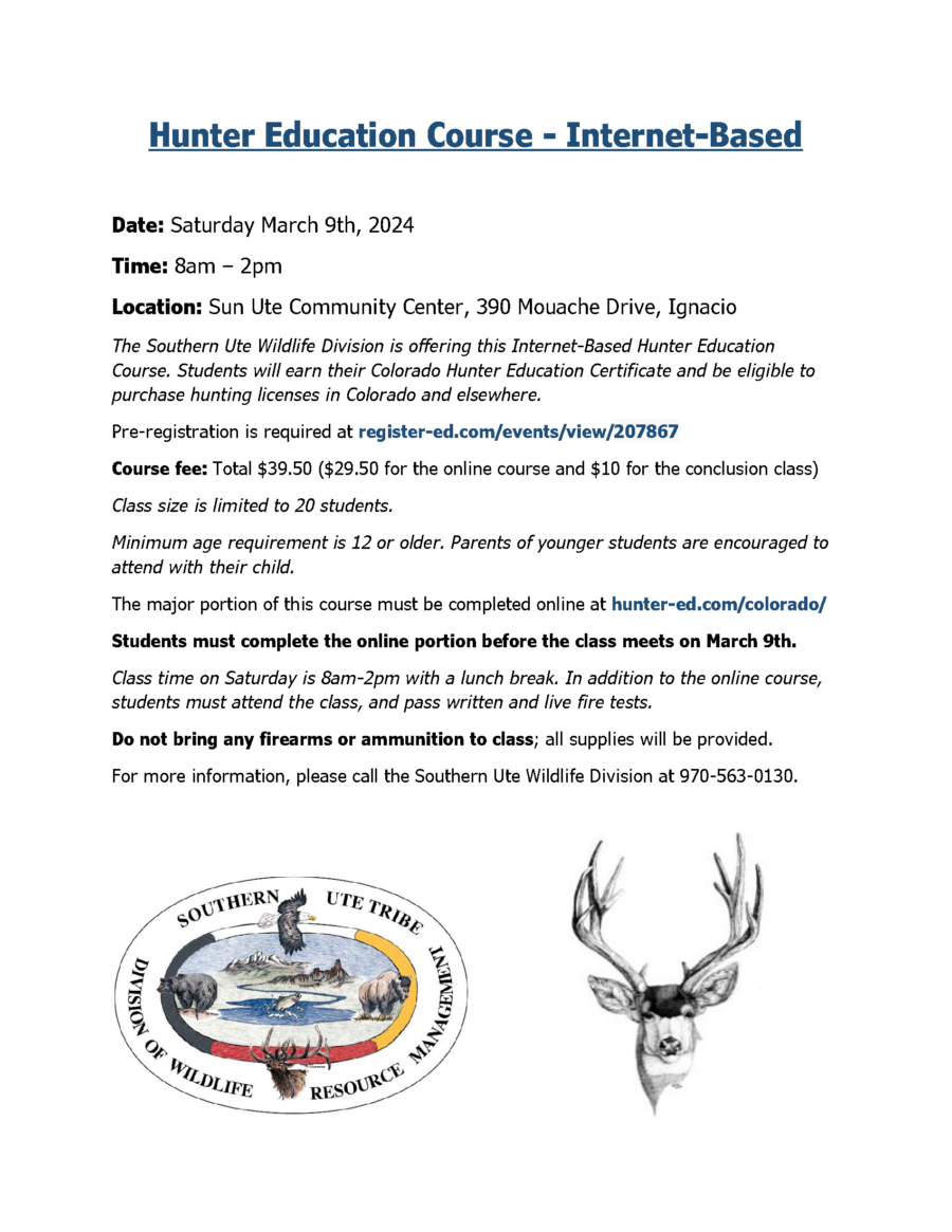 A Hunters Safety Conclusion Course is scheduled for March 9th, 2024, from 8:00 a.m. – 2:00 p.m., through the Southern Ute Wildlife Division.